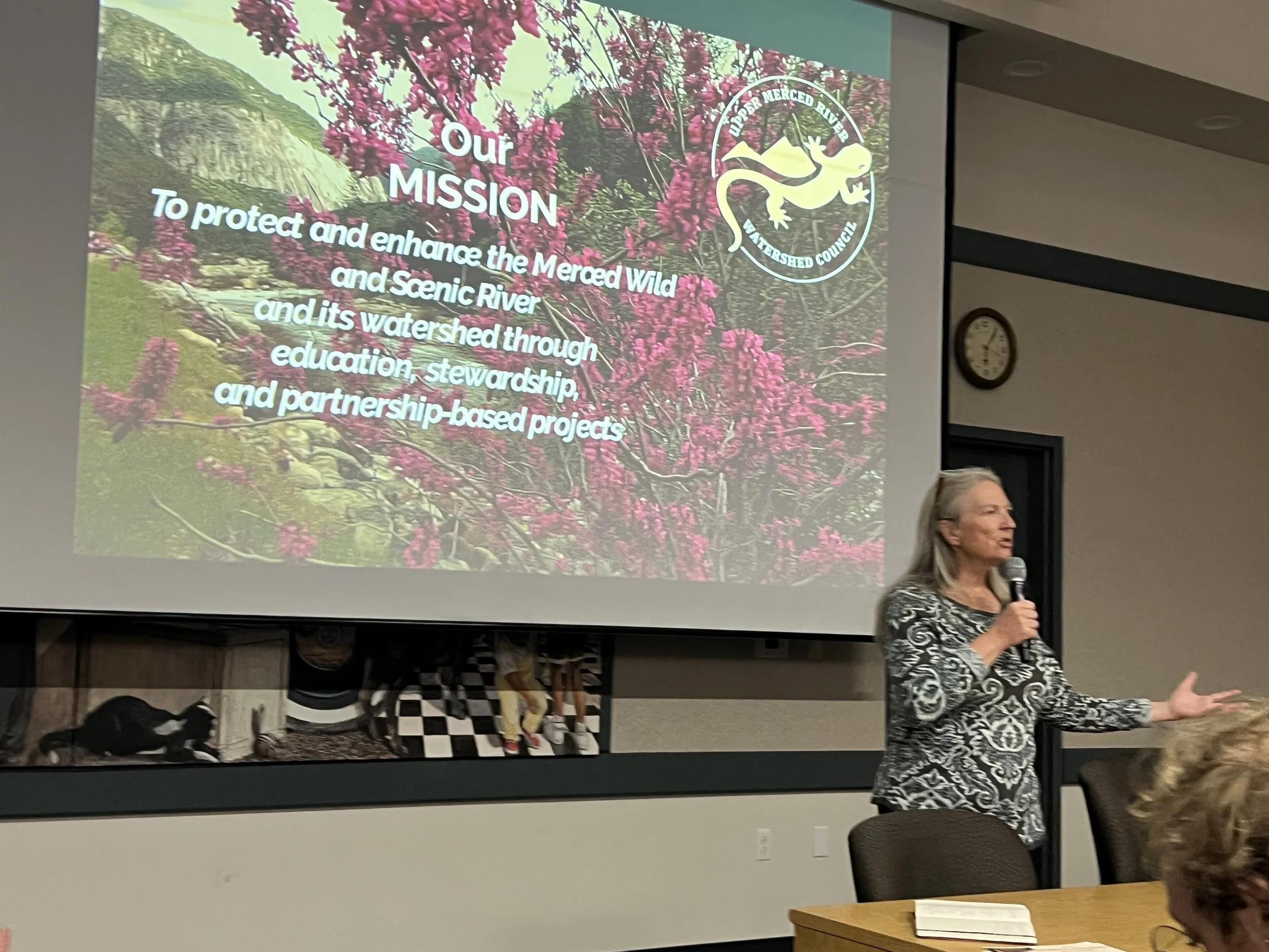 Kristina Rylands, Board Director and Vice Chair of the Upper Merced River Watershed Council, opens An Evening with Tim Palmer with a welcome and an overview of the Council’s mission and core values.