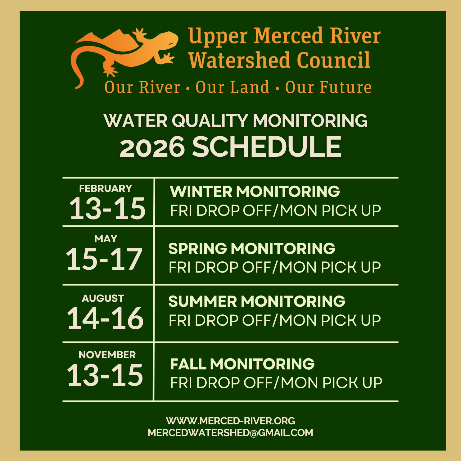 Since 2004, the Upper Merced River Watershed Council has conducted water quality monitoring along the Merced River with teams of community volunteers.